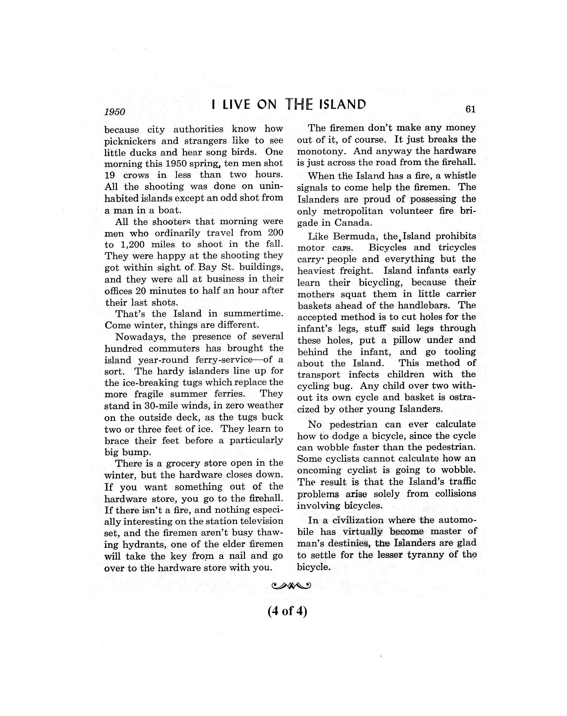 Mrs.AnnieLairdandhersonBobownedandoperatedthesinglestorey building,‘The Beeches’, containing a number of small apartments at 34 Manitou Road. The author and his wife spent their first winter on the Island here. Although, like many Islanders, we had no inside plumbing conveniences, we hauled water from a tap on the front lawn, which was left running all the time to avoid freezing, we survived the winter quite com- fortably with our small Coleman oil space heater, purchased from Buster Ward. The pipe did freeze one time and Bill Sutherland was called upon to thaw out the pipe using a car battery with wires attached to the tap at one end and the city connection at the other end.